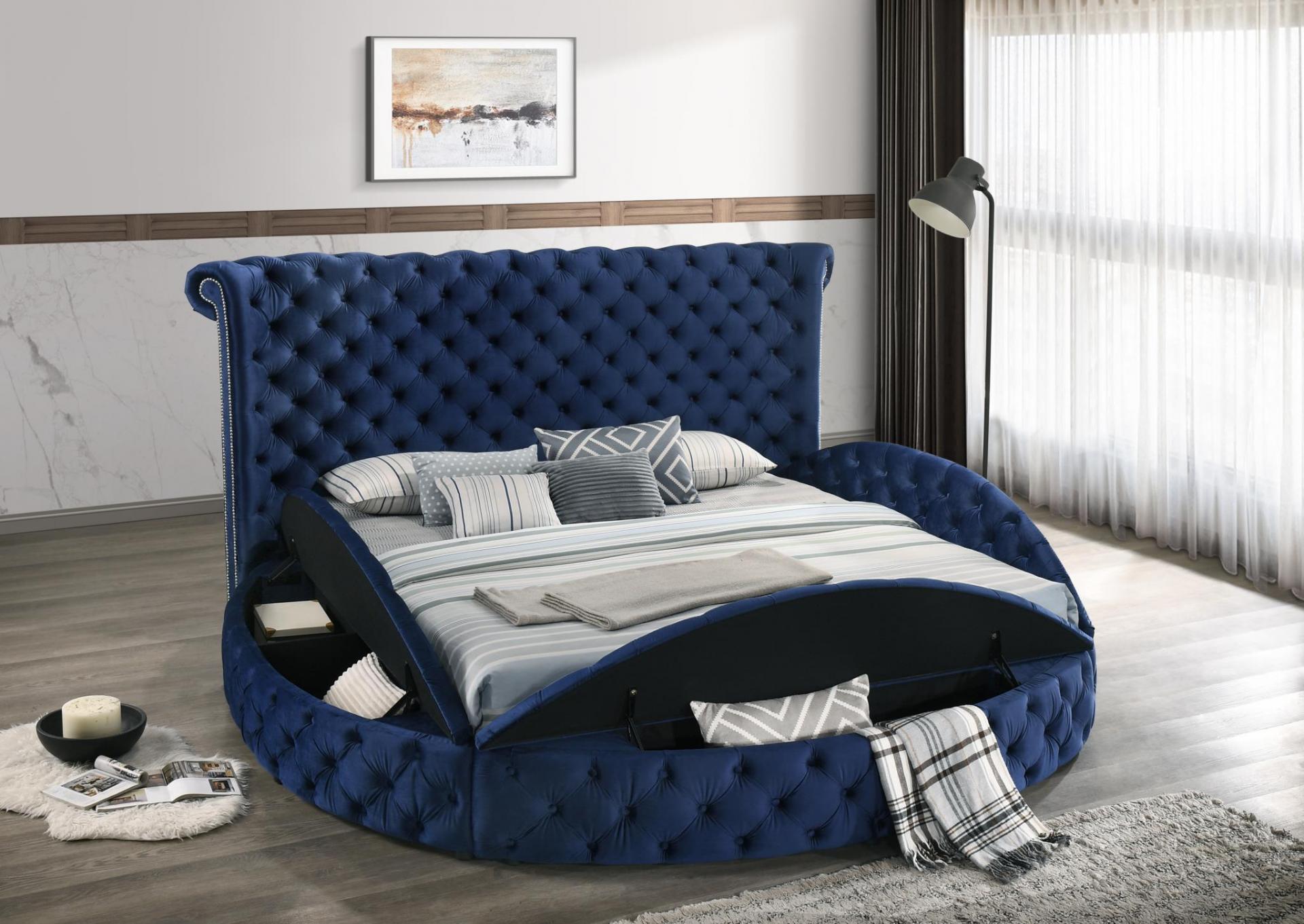 Terciopelo de lujo azul y acentos capitoné con botones. Acentos de cabeza de clavo aplicados a mano. Diseño de forma aerodinámica y cabecera de ala trasera.