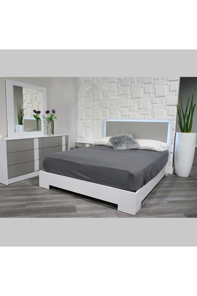 Cama y piezas del conjunto fabricadas en melamina madera resistente a la humedad y rayaduras, con luz LED en el cabecero y mando a distancia para cambiar colores e intensidad.