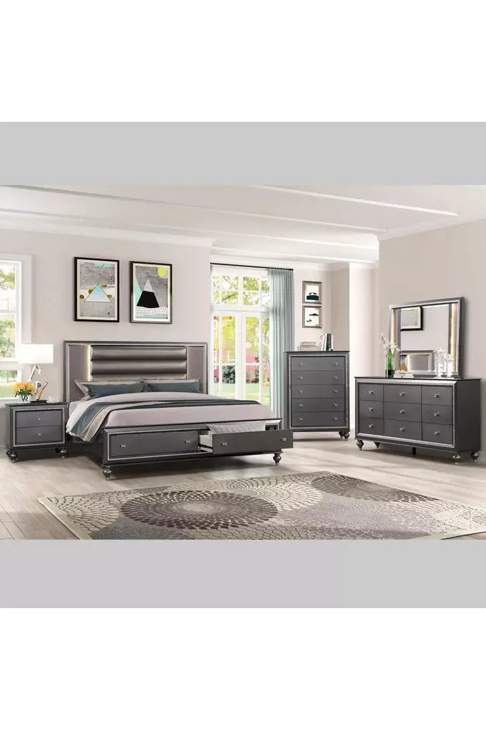 Juego de dormitorio LED gris con cama Queen y cajones con pie de cama
