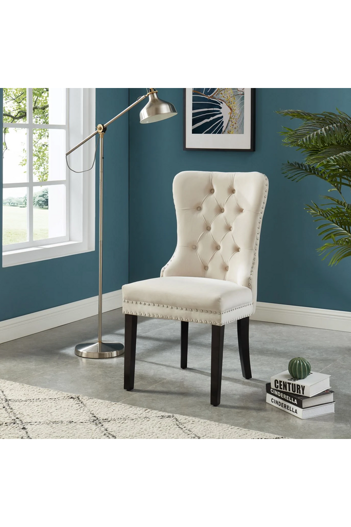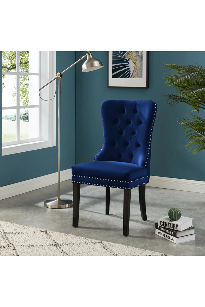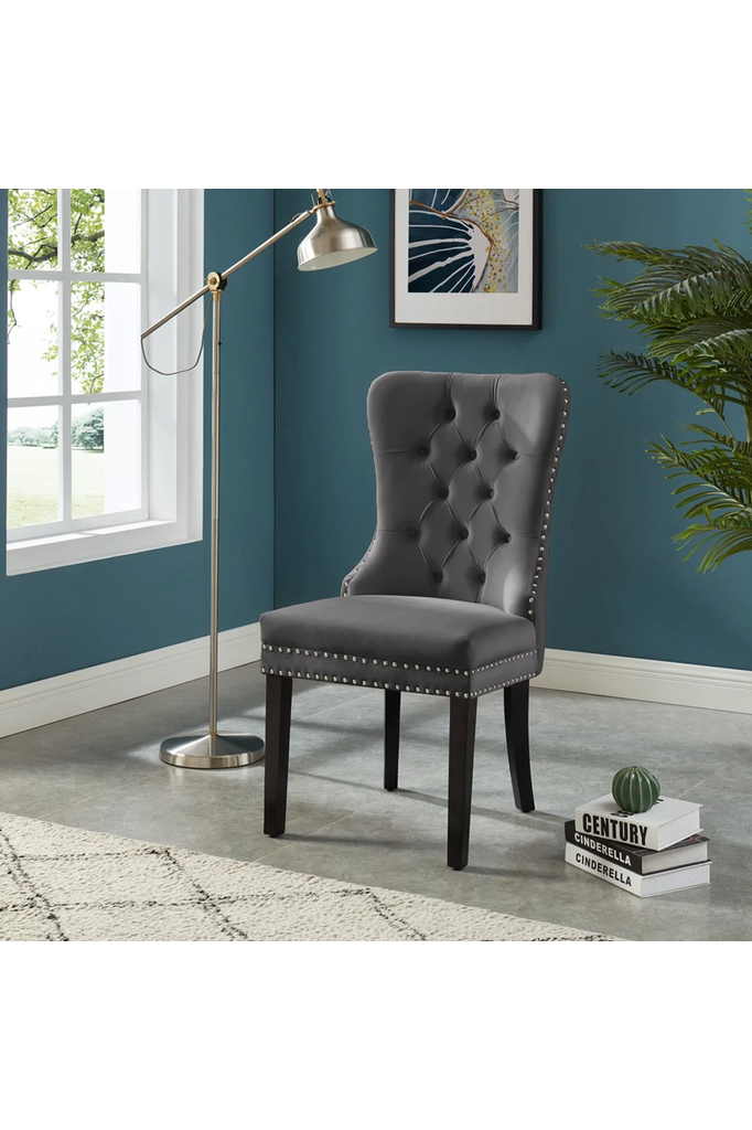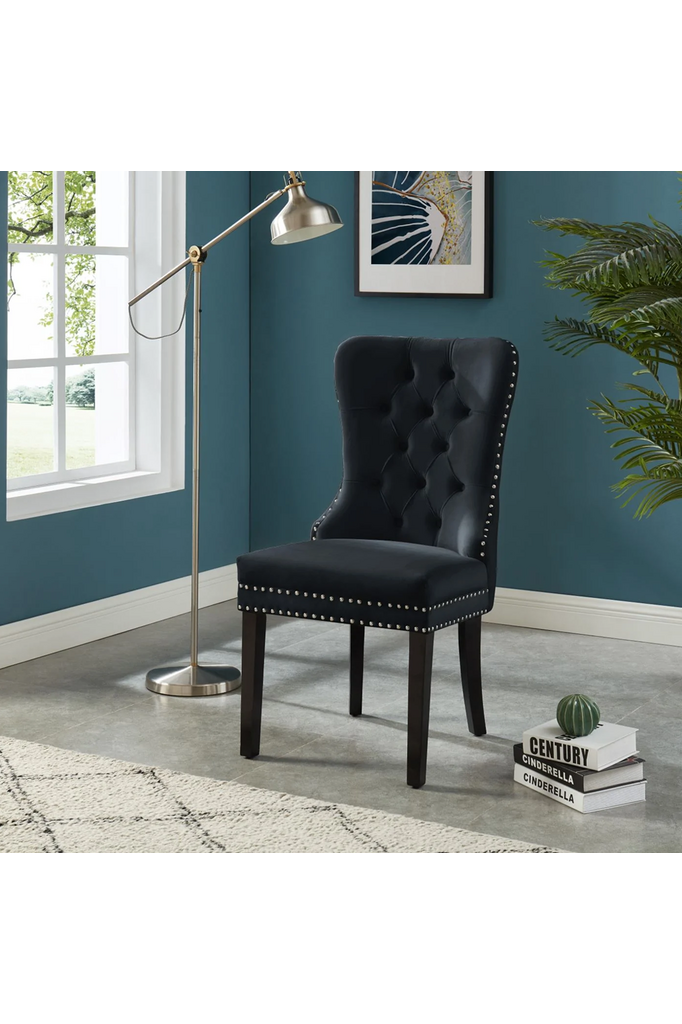 Cene con estilo lujoso con esta silla de comedor tapizada Stonefort. Con un asiento acolchado de felpa con respaldo alto curvado y una tapicería de terciopelo negro con mechones profundos tachonados con cabezas de clavos, esta silla de comedor seguramente llevará su experiencia gastronómica a un nivel completamente nuevo. Las patas de madera espresso brindan un soporte resistente y complementan la impresionante tapicería para lograr un diseño elegante y contemporáneo.