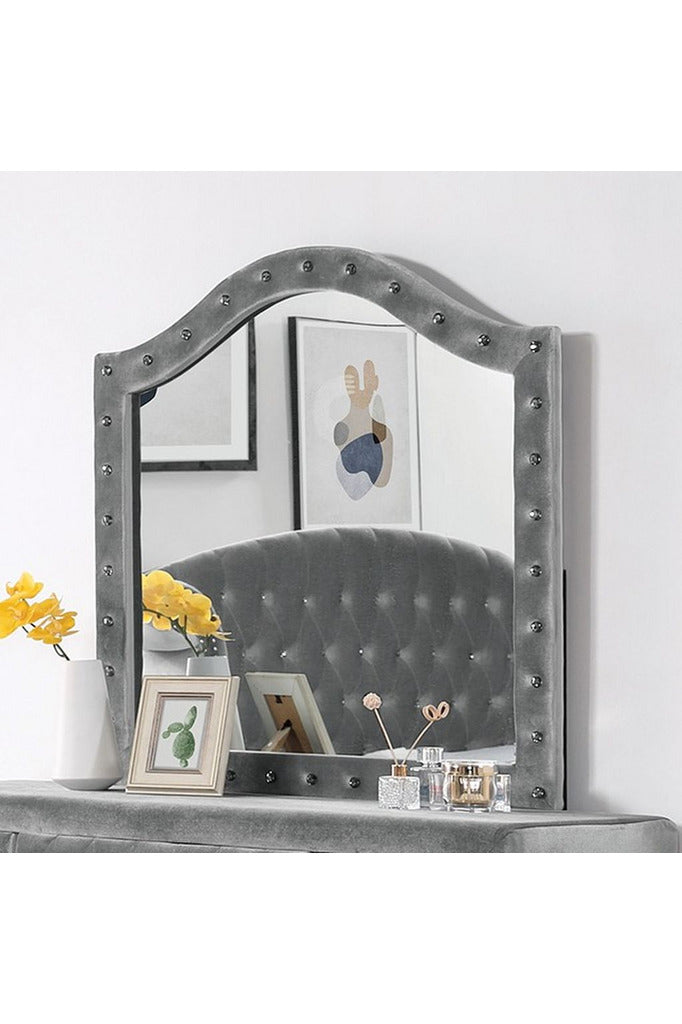 Muestre su gusto personal con esta llamativa pieza en su dormitorio. Totalmente tapizado en franela, este espejo cuenta con tela acolchada y botones de cristal, lo que aporta las vibraciones majestuosas que este conjunto se propuso crear.