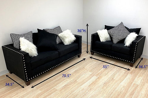 This Contemporary Two-Piece Sofa Set features a bold sapphire black durable polyester base cloth with stylish Nail-head trim and track arm styling. A deep Chaise lounge and contrasting back and toss pillows add versatility to the group. Contemporary Style. Accented with Chrome Nail-heads, Faux Fur Accent Pillows.