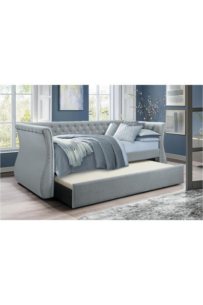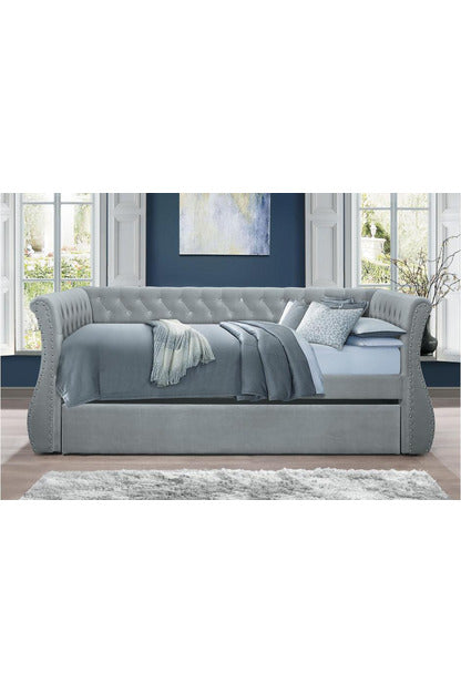 Positively radiant from top to bottom, the Gossamer Collection will lend an air of elegant sophistication to your bedroom. Gray velvet is accented with nailhead and pleated crystal button tufting while dramatic curves create a glamorous profile for your bedroom. Whether used for sleeping or relaxing, the daybed’s design allows for placement in a number of room sizes and configurations, while the under-bed trundle pulls out to accommodate your additional sleep space needs.