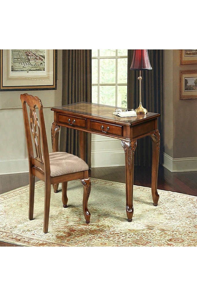 Daydream of traveling the world, or plan your next vacation at this traditional desk and chair set. Constructed from poplar, Asian hardwood, MDF, and birch veneer, this desk is finished in a golden brown with an old-world faux-leather upholstered desk top. Ornate hand-carved cabriole legs give this desk set a lot of character. A matching chair is included, with a traditional floral fabric upholstered cushion.