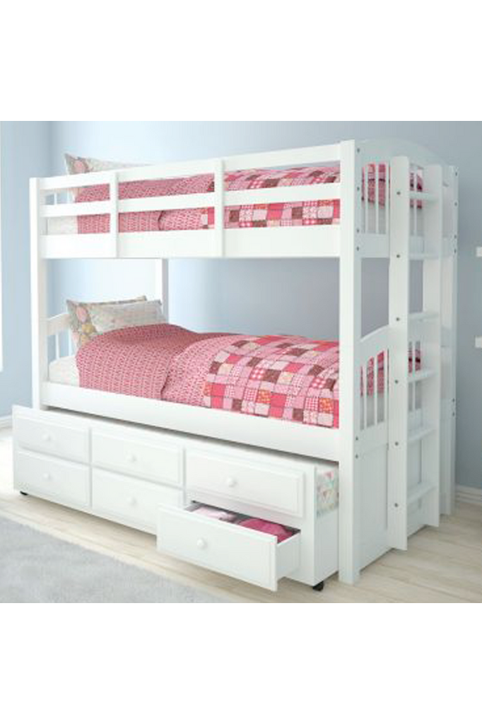 The Micah twin over twin bunk bed is the perfect solution for shared or small spaces. The white mission style platform bunk beds are made from solid wood frames and features a trundle with three drawers for extra storage, full length guard rail on top bed, and side ladder. This bed can convert from a regular bunk style to two separate twin beds to fit your space's needs. This bunk bed is ideal for any kid's room or guest room.