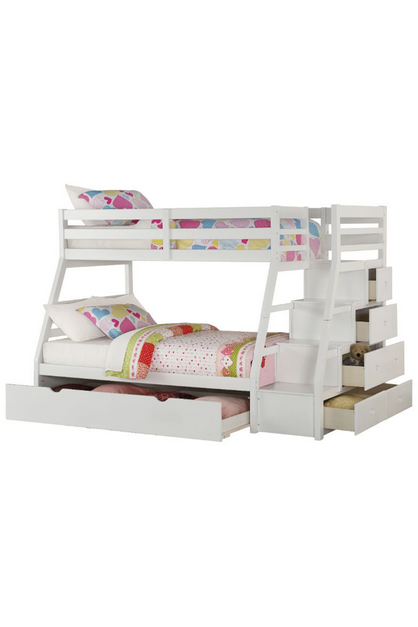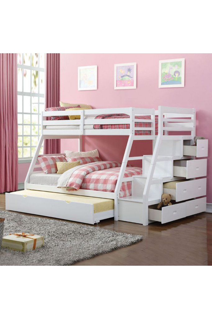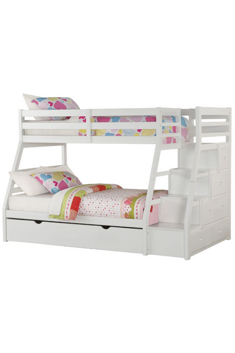 This bunk bed is a twin over full bunk bed with plenty of built in storage with drawers incorporated into the stairs to upper twin bed. An additional trundle pull out bed under the lower full bed creates more space for extra use. A full guard rail will always keep your lovely kids safe.