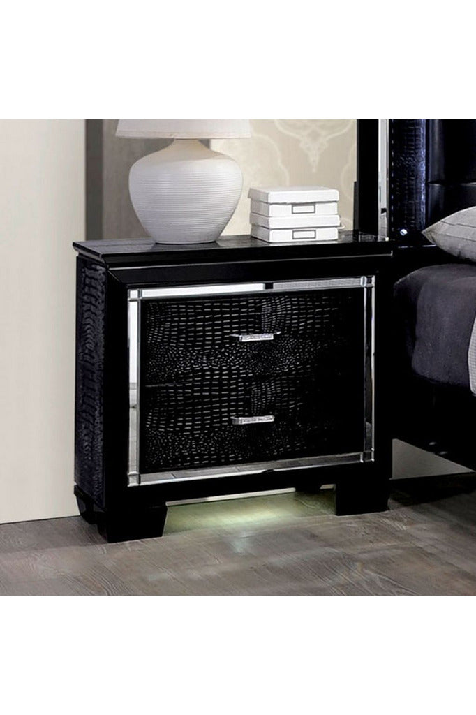 Specifically designed to accentuate a glamorous feel, this bedroom collection brings a combination of class and contemporary style to your bedroom. Crocodile embossed veneer and silver lining panels stand out throughout every piece while, the bottom of this has built-in LED lights to illuminate the mood.