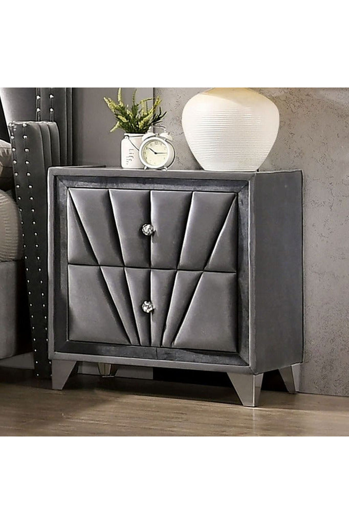 The ultimate Art Deco-inspired ! The elegance, glamour, unique shapes and vintage appeal of 1930's Hollywood is right here! The decadent gray velvet upholstery looks like it came right out of a classic old movie! There's a prestige with the unique design that seems to capture all of the excitement of a beloved bygone era! Additional embellishments such as rhombus chrome feet and diamond ring drawer-pulls faithfully enhance the cinematic reality.