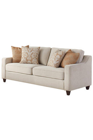 | Wrapped in a light and bright, beige woven chenille upholstery, this sofa lends itself to your existing color palette effortlessly. Elegant, sloped track arms and tapered dark brown legs create an understated flair to a transitional style living room or contemporary home. Boxed seat and back cushions feature classic welt details, while coordinating accent pillows in a coral and copper tones and Ikat pattern add a boho coastal touch. Place this sofa in a space for a subtle chic look and contrasting colors. Add the available matching loveseat to complete an entire seating ensemble. |