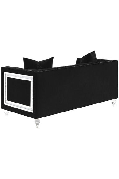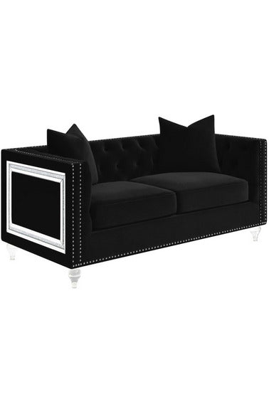 | * Elegant low profile button tufted shelter back sofa collection upholstered in a luxurious black velvet * Double row of small chrome, individually hammered nailheads frame the top back and arms * Outside arms accented with a mitered mirror and acrylic crystal frame inset * Reversible seat cushions for extended wear * Stylish turned clear acrylic legs add the finishing touch |