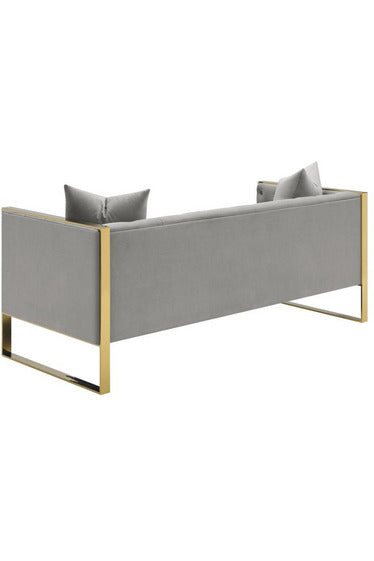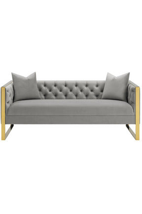 | This visual appeal of this modern two-tone sofa will grab you, but it's the cozy comfort that will have you falling head over heels. First to catch your eye is the button tufted velvet upholstery in a cool light grey finish, which is as soft to the touch as alluring to the eye. Two included throw pillows will have you looking forward to your next nap, as well. Next to catch your attention is the gold stainless steel base that wraps around the arms and acts as U-shaped legs. This mix of gold metal and soft grey fabric come together in a sofa that will become a classic gathering place in no time. |
