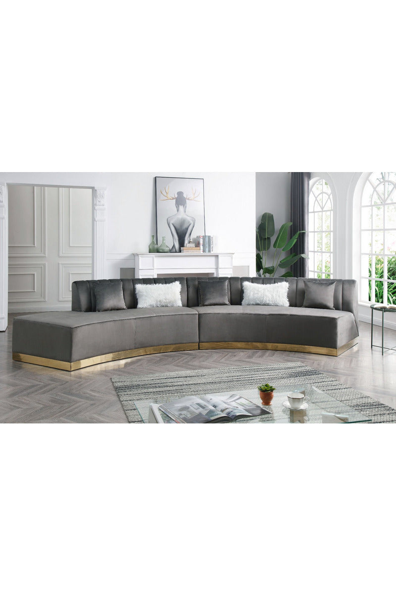 Unique curved sofa is covered in soft velvet. Channel quilted for additional comfort. Add additional sofa or sofa chaise pieces to make a large sectional.