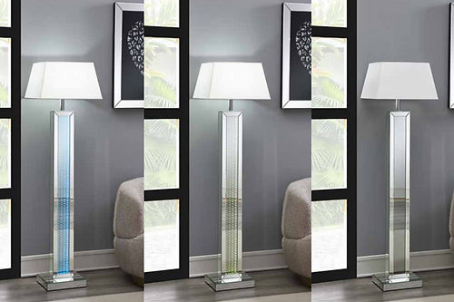 • 8mm Mirror Overlaying MDF and Particle Board • 3D Accented Effect • Beveled Edges • Multi Color LED Accents • Accented with White Lamp Shade