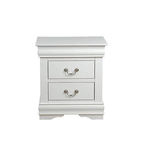 The Louis Philippe two drawer nightstand in white finish boasts engineered wood and veneer craftsmanship for enduring elegance. Brush nickel metal hardware adorns each of the drawer fronts and it's framed by crown molding detail.