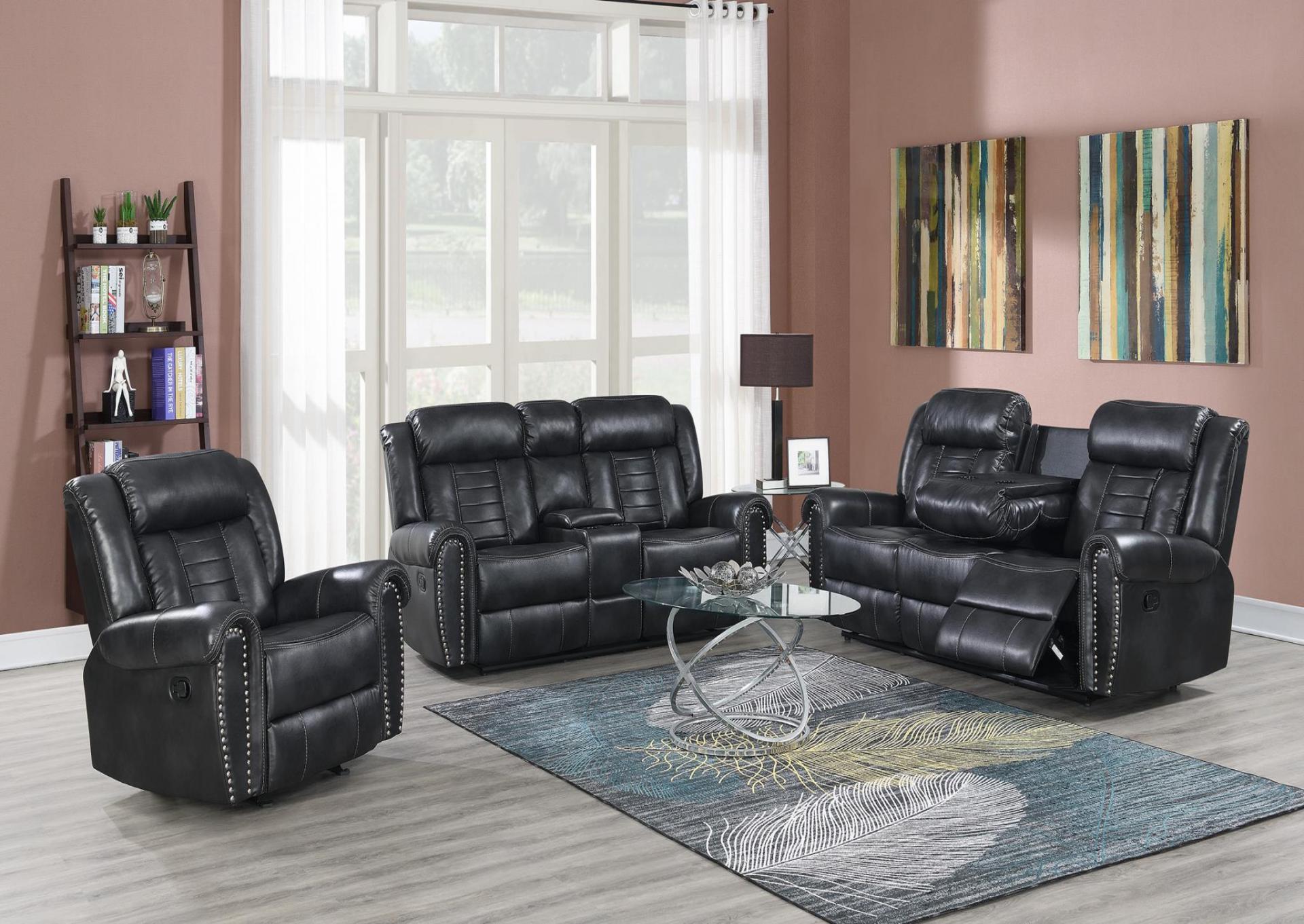 Sofa and loveseat upholstered in leather, with console and cup holder, totally new manual recliner with manufacturer's warranty