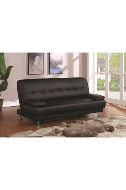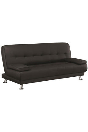 | * Transitional style sofa bed upholstered in leatherette * Tufted seat and back * Removable armrest pillows * Back folds flat for easy conversion from sofa to bed * Kiln-dried hardwood frame * Durable sinuous spring decking with high resilience foam seat * Metal legs electroplated in chrome * Available in black leatherette, brown leatherette, and tan microfiber |