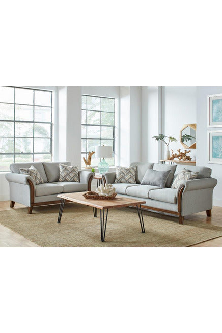 | Complete a living room seating area in a beachside cottage or condo with this transitional two-piece sofa and loveseat set. Featuring a neutral platinum grey fabric, this charming sofa and loveseat complement numerous color palettes and decor styles, lending traditional touches along the way. Contrasting and accenting each piece is a wood trim molding with a brushed brown finish, lending an earthy quality. Breathe more freely, knowing each upholstered piece is stuffed with environmentally-friendly polyol filling. Elegant traditional style shines through in this sofa and loveseat flared rolled arms and tapered feet. |