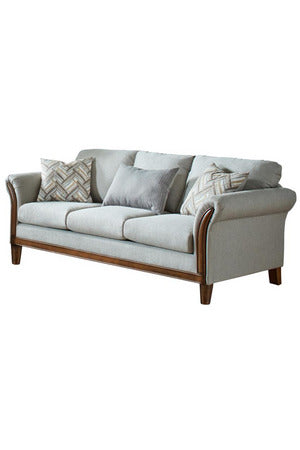 | Elegance and traditional touches are what stand out in this transitional sofa. Wrapped in a platinum woven upholstery with natural brushed brown wood trim, this sofa features a lovely contrast of light and earth-tone hues. Dense cushions are filled with eco-conscious polyol filling, designed to provide seating for green-friendly lifestyles. Included with this sofa are three accent pillows; two of which are square knife edge style and the third a rectangular lumbar shape. Complete an entire seating set with a matching loveseat, tying together your coastal cottage or boho-inspired retreat. |