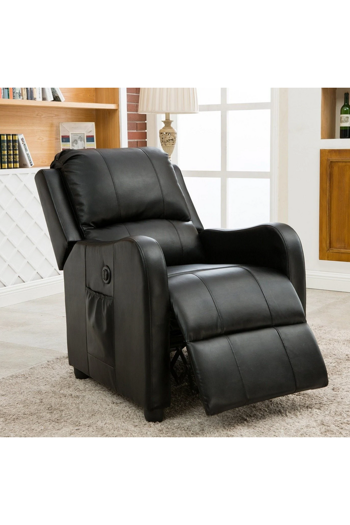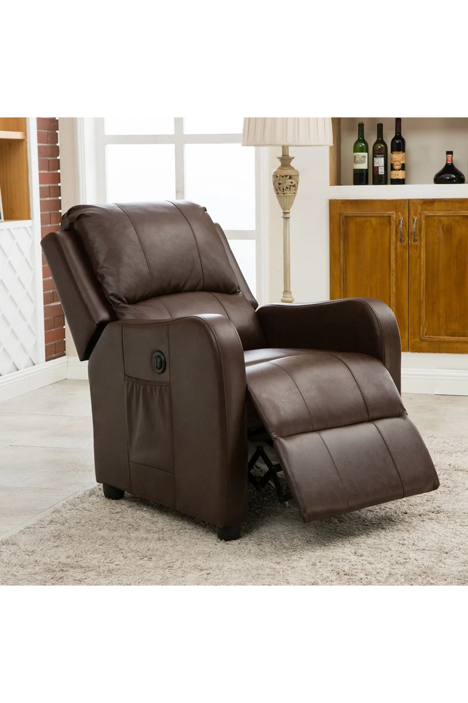 Wind down after a long day with this durable and ultra-comfortable power recliner. The contemporary bonded leather design is sleek, and the black or brown color options fit right in with your living room setting. Enjoy maximum comfort courtesy of generously padded seat and back cushions, while the side pockets provide convenient storage for your TV remote or reading materials.