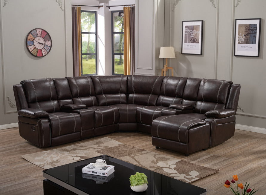 Create the ultimate entertainment room or family room with this spacious reclining sectional. Hardwood frames and coil cushions promise durability, while pad-over-chaise seats provide comfort from head to toe. The sectional includes two reclining seats and one reclining chaise that give you ample room to spread out. Two consoles offer a combined four cup holders and two storage compartments - perfect for storing movie night snacks and drinks.