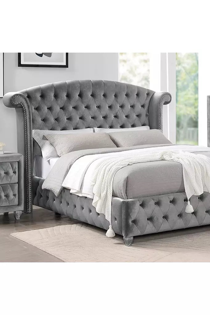 Showcase your personal taste with this bold statement piece in your bedroom. Fully upholstered in flannelette, this bed features an oversized wingback headboard with eye-catching tufting and lined with nailhead trim. The padded fabric and crystal buttons continue all throughout the bed frame and the matching case goods. Each drawer handle is made of glistening acrylic crystals, while silver-painted cabriole legs are perfect in bringing in majestic vibes that this ensemble set out to do.