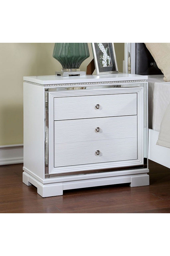 Glamour meets modern in this brilliant bedroom piece. The straight edges of this are delicately lined with mirror accents. As light bounces from the window to the trim and across the bright white finish, the organic texture present on the front panels helps bring balance to the wintriness of the piece. Safely store your valuables in a hidden drawer, or plug and charge your devices with the USB/power outlet.